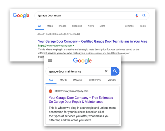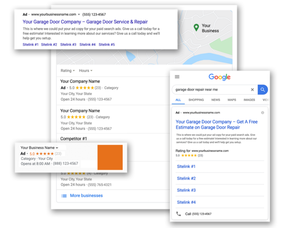 Get your garage door business to the top of Google fast. We manage targeted Google and Bing Ads that appear when customers search for your services on search results, maps, and partner sites.